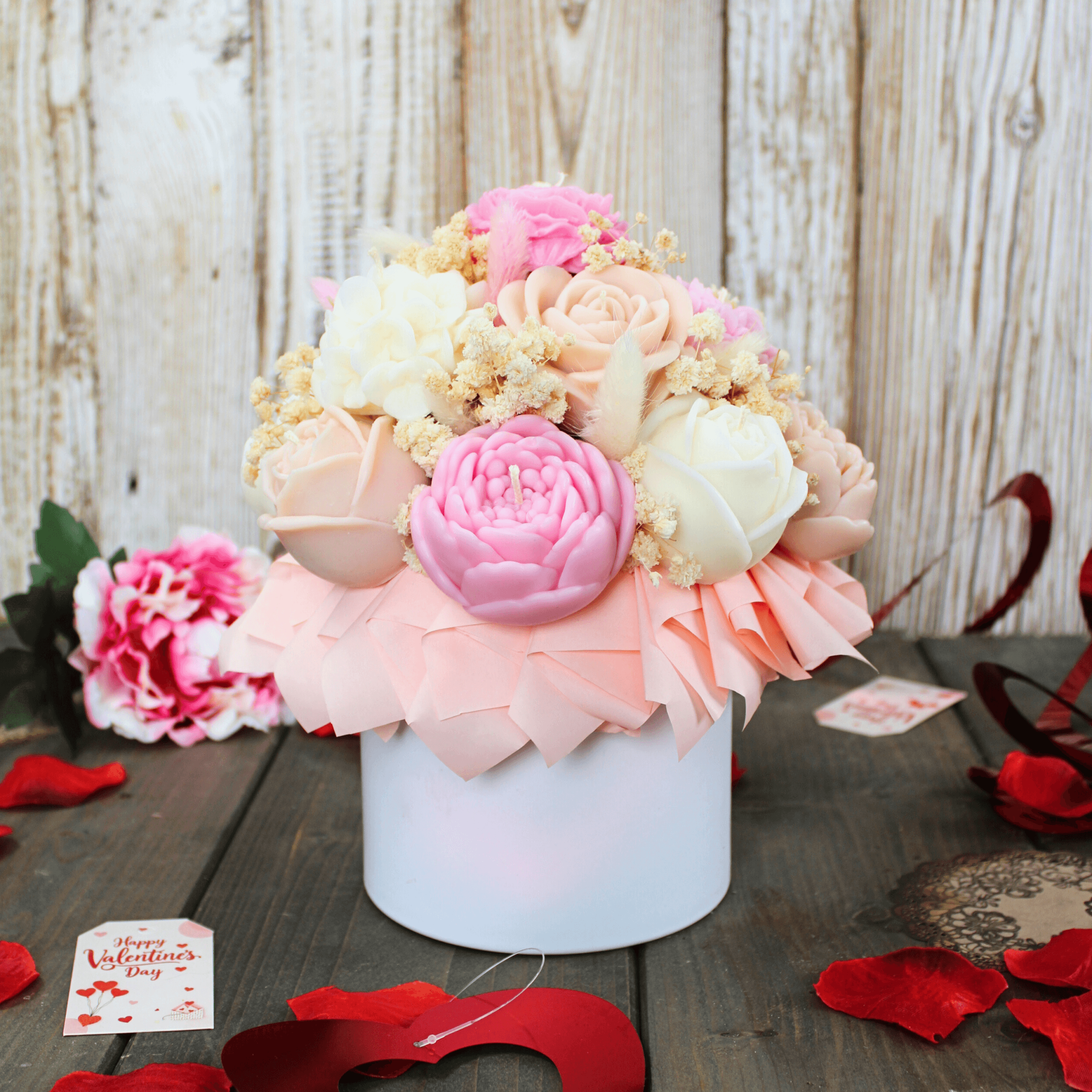 Elegancki flower box ze świec sojowych Biały o zapachu pudrowej piwonii to wyjątkowy prezent na każdą okazję. Idealnie sprawdzi się na urodziny, rocznicę, Walentynki czy Dzień Kobiet – zachwyca estetyką i nie zawiedzie obdarowanej osoby.