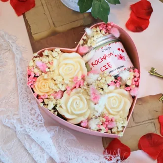 Box łączy w sobie trzy kolory świec: beżowy, różowy i biały – elegancja sama w sobie. Wszystko zapakowane w stylowy biały box, który dodaje całości klasy i sprawia, że prezent wygląda luksusowo i dopracowanie.