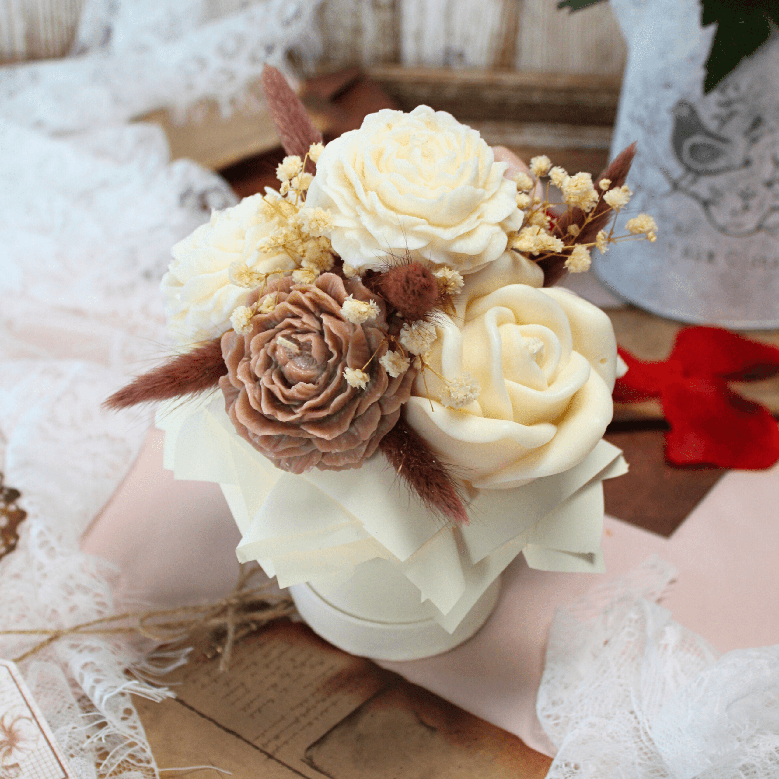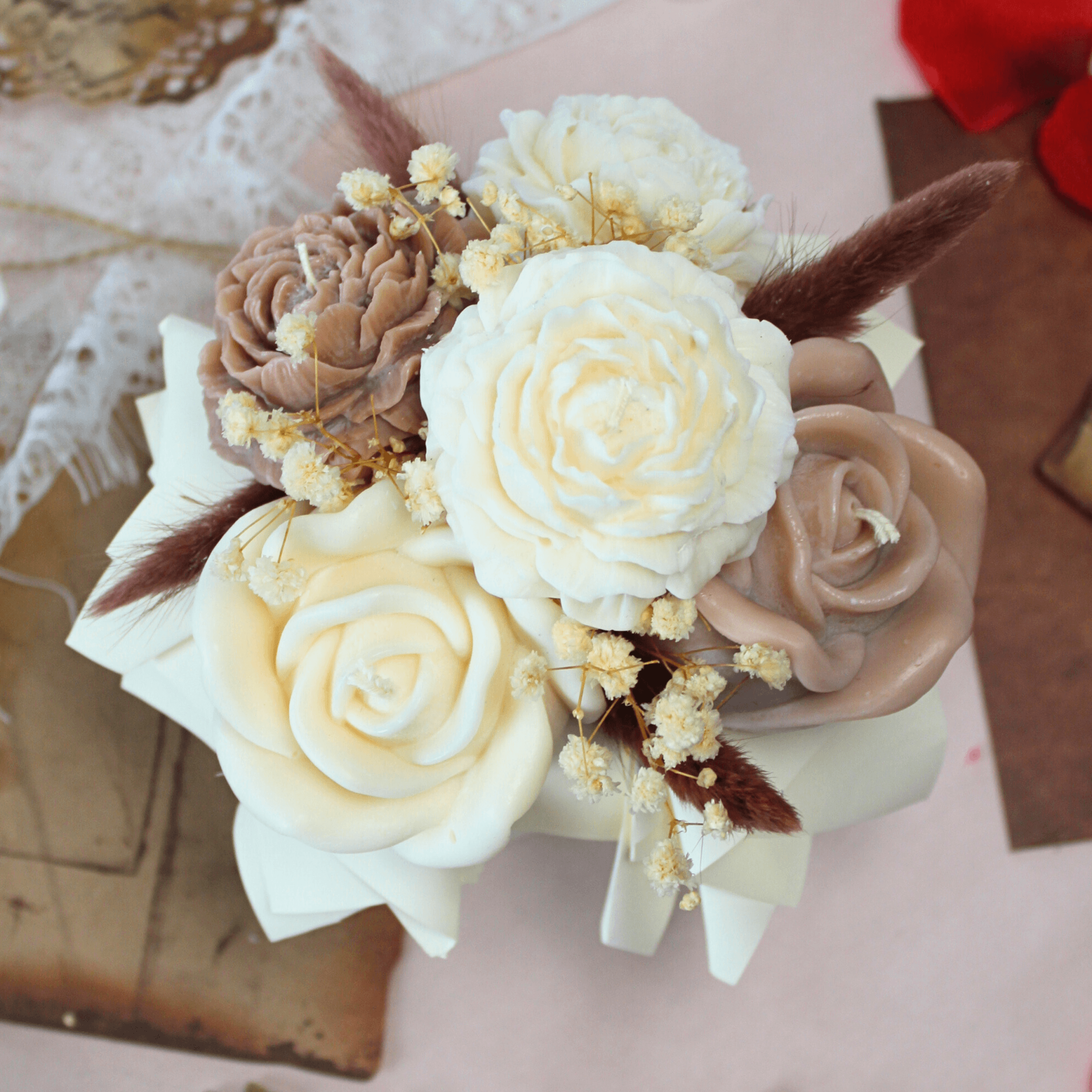 zawartość: 3 mini piwonie i 2 róże ze świec sojowych