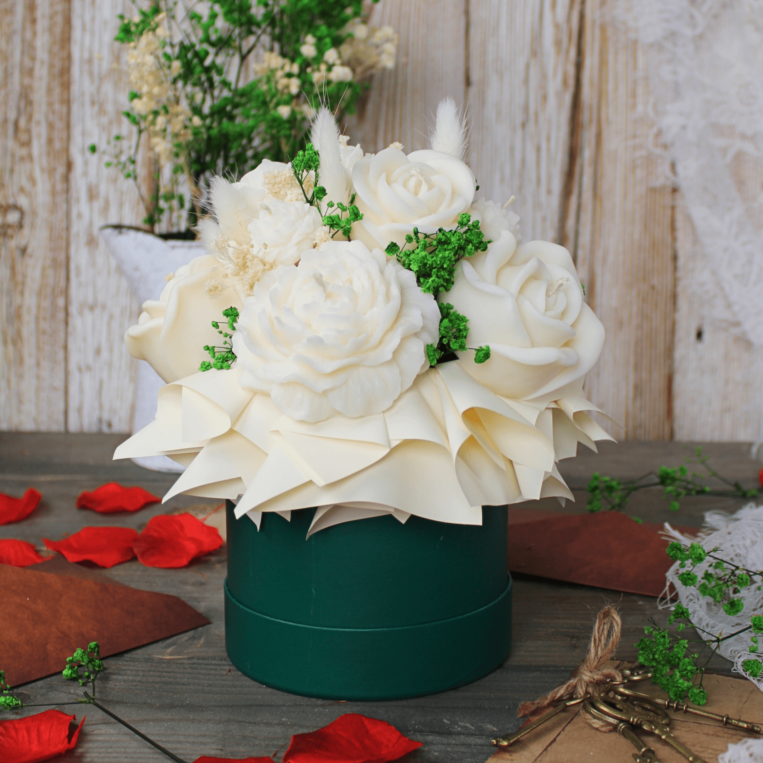 Elegancki flower box ze świec sojowych w kolorze butelkowej zieleni z jasną, klasyczną kompozycją w odcieniach bieli. Całość uzupełniona została stabilizowanymi kwiatami, które nadają kompozycji luksusowy i ponadczasowy charakter.