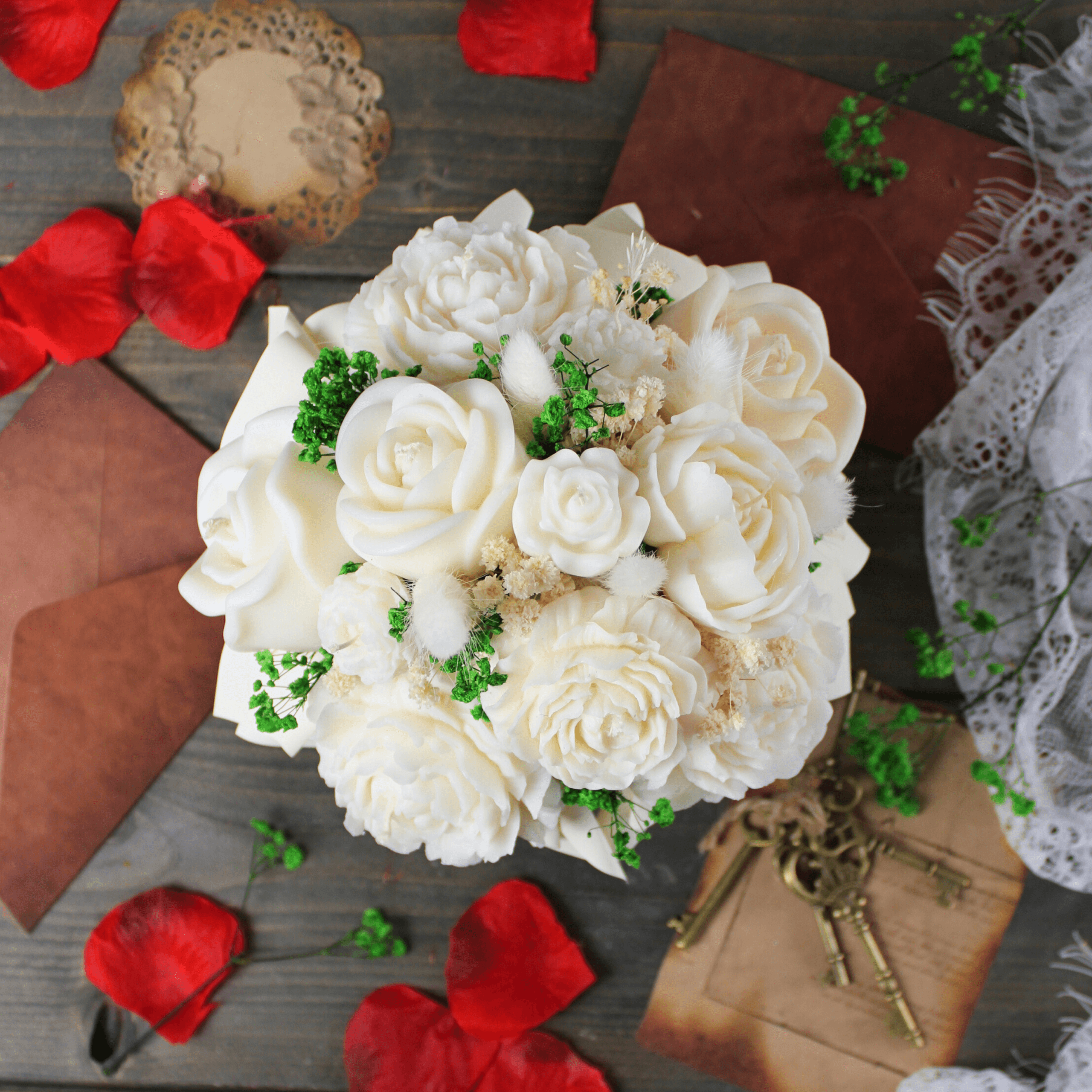 Świece wykonane z naturalnego wosku sojowego wypełniają flower box kwiatowym zapachem piwonii, tworząc subtelną i elegancką atmosferę. To trwała i estetyczna alternatywa dla tradycyjnych bukietów.