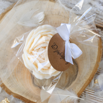 Świeca sojowa w kształcie róży zapakowana w celofan, z drewnianą podstawką i obwiązana wstążką z personalizowaną etykietą w kształcie serca.