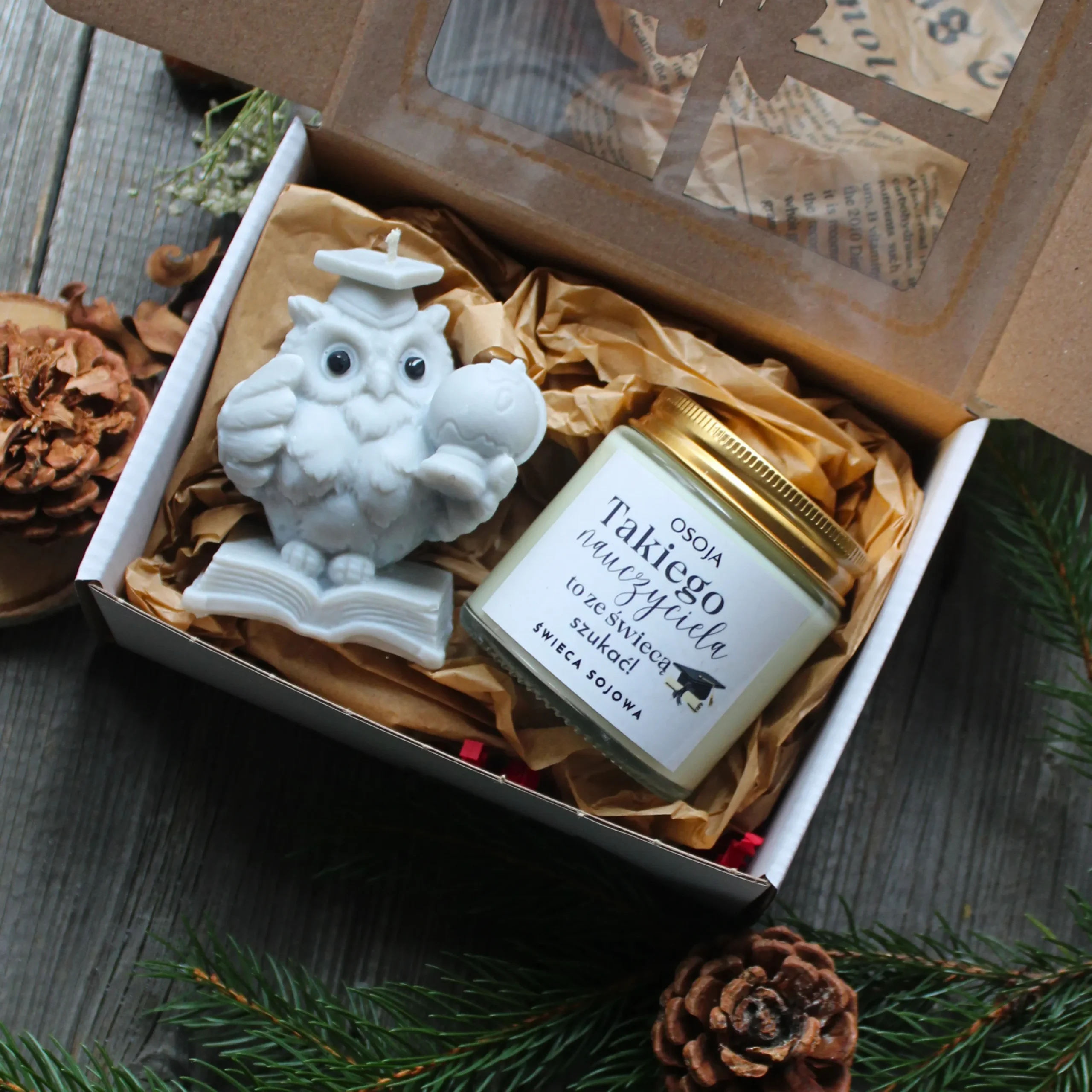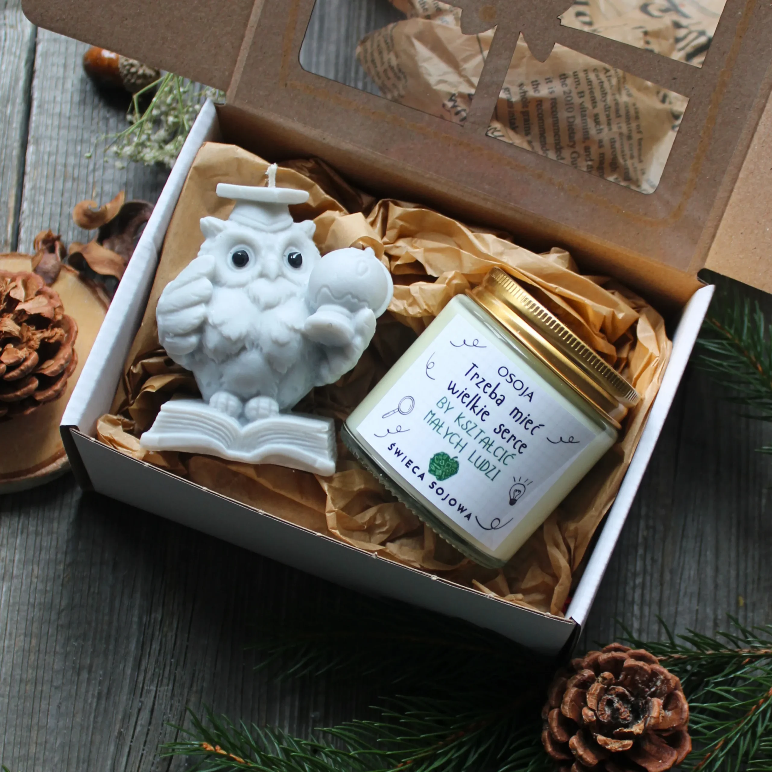 Zestaw prezentowy: świeca w kształcie sowy z globusem + świeca sojowa 120 ml z napisem do wyboru. Idealny, pachnący prezent na Dzień Nauczyciela i zakończenie roku szkolnego.